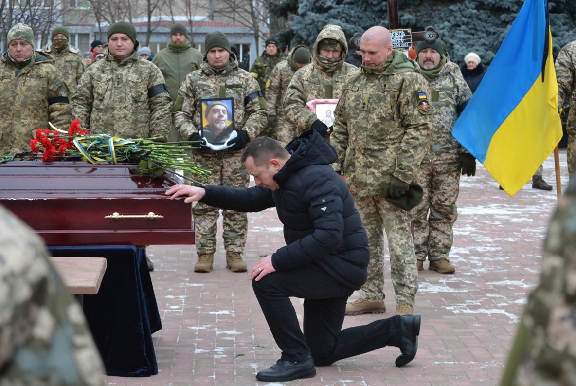 Після прощання з усіма військовими почестями та покладанням квітів до труни, траурна церемонія продовжилася на кладовищі. Южноукраїнці провели в останню путь Героя-земляка, стоячи на колінах, схиливши голови в скорботі.