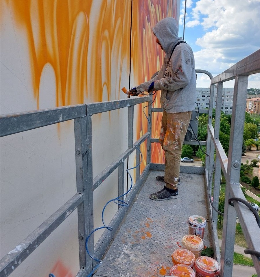 – Якби було риштування, можна було б погратися ще й пензлями. Оскільки працюємо в люльці, це трохи ускладнює процес, бо вона гойдається від вітру. До того ж обставини вимагають швидко вести лінію. Завдяки розпиленню фарба відразу підсихає і дрібний дощ не зіпсує малюнок. Від сильного дощу ховаємося, припиняємо роботу, – ділиться нюансами художниця.