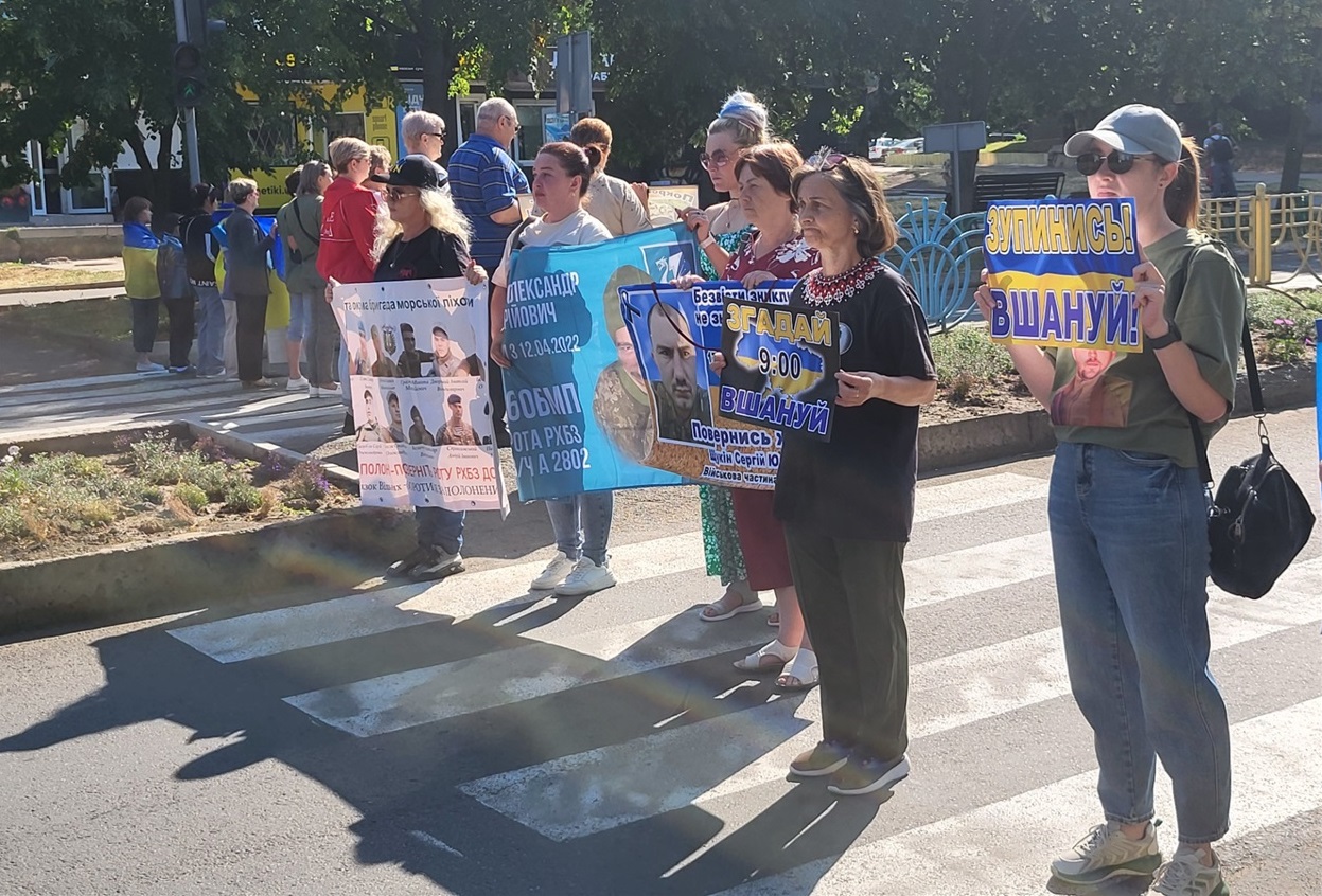 Зупиняються і перехожі, які опинилися на вулиці Європейській біля мерії. Активістки руху підтримки військовополонених і зниклих безвісти з 22 червня цього року започаткували перекриття проїжджої частини вулиць, виходячи під час хвилини мовчання на пішохідний перехід з прапорами та відповідними гаслами. Раз на тиждень, у неділю, це відбувається на проспекті Незалежності.