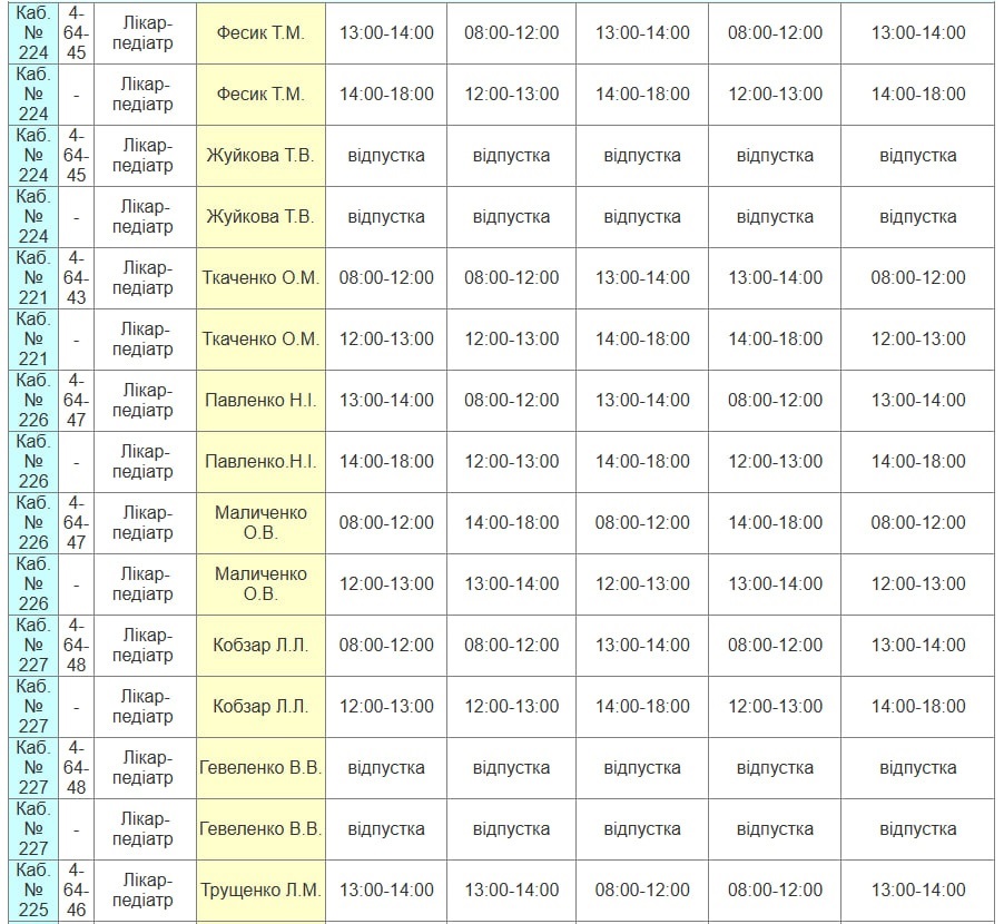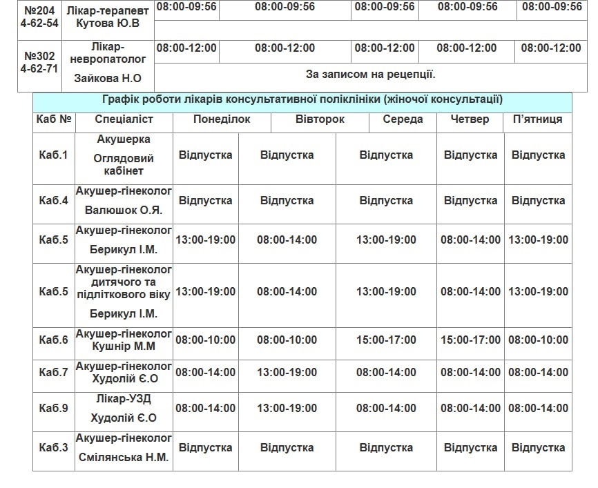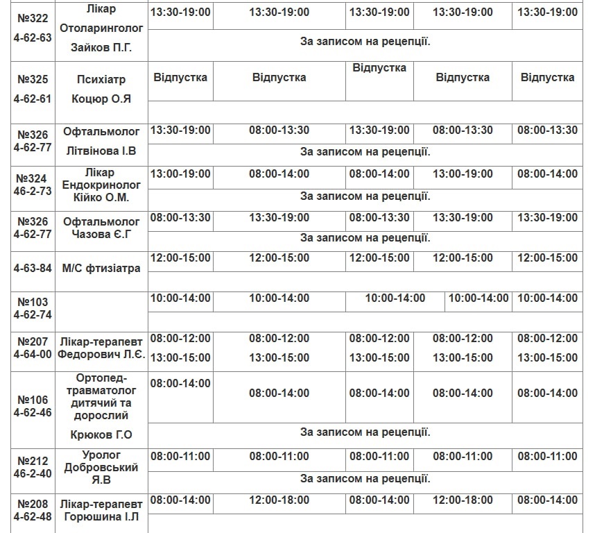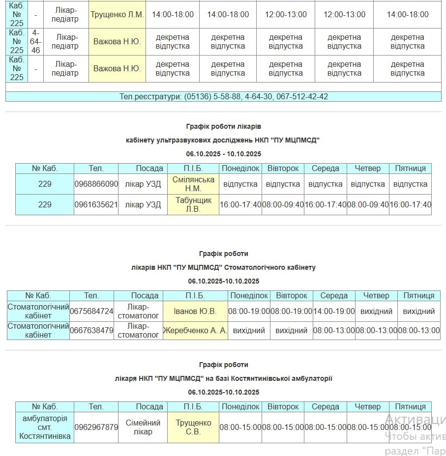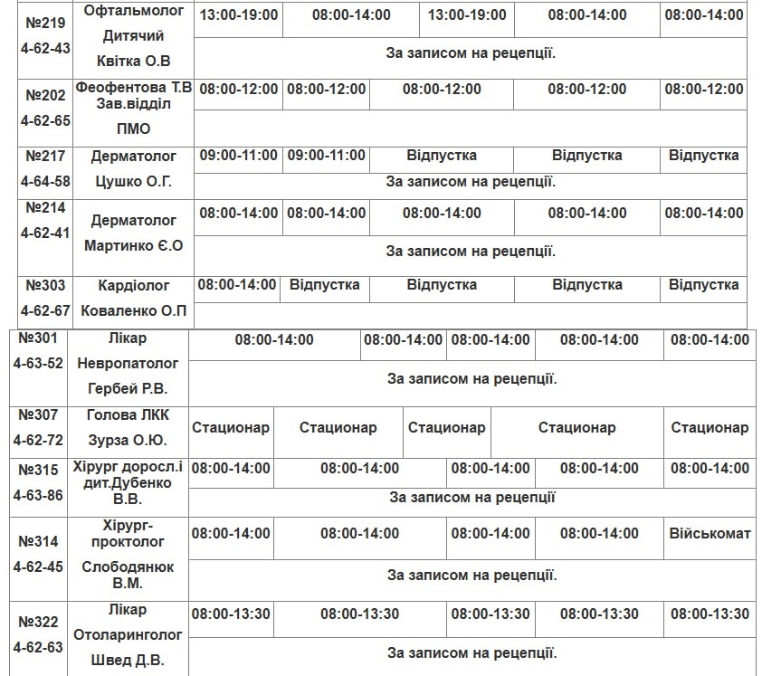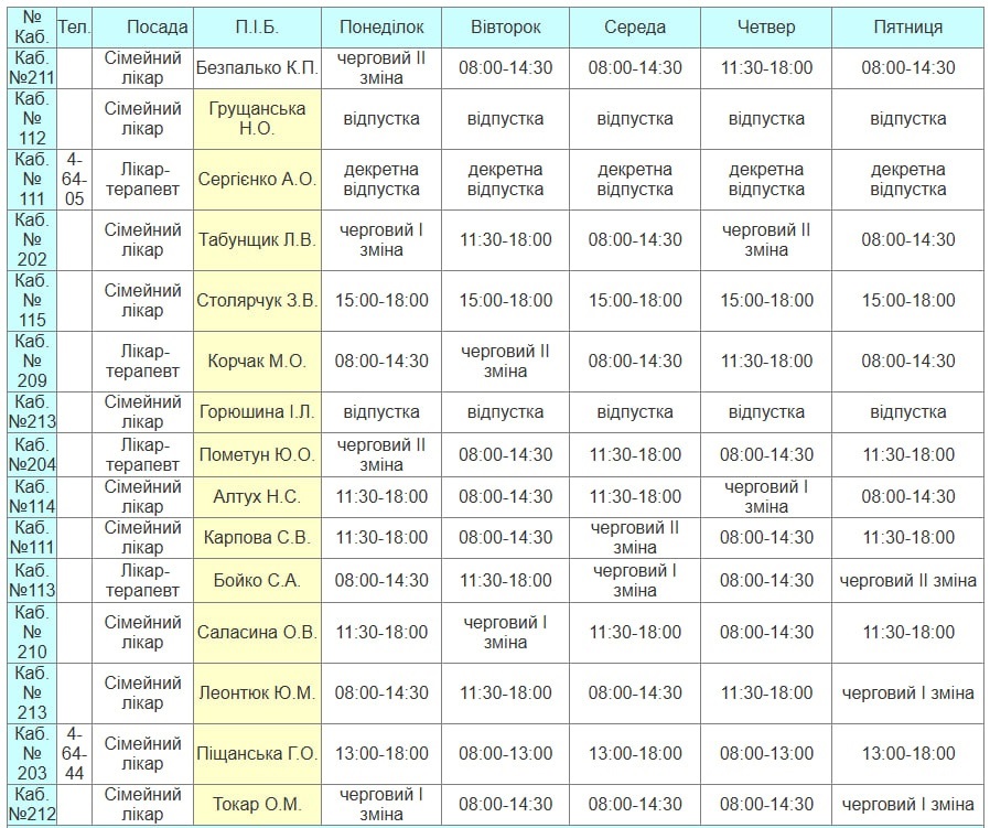 Графік роботи лікарів НКП «ПМЦПМСД»з 06.10.2025 по 10.10.2025
