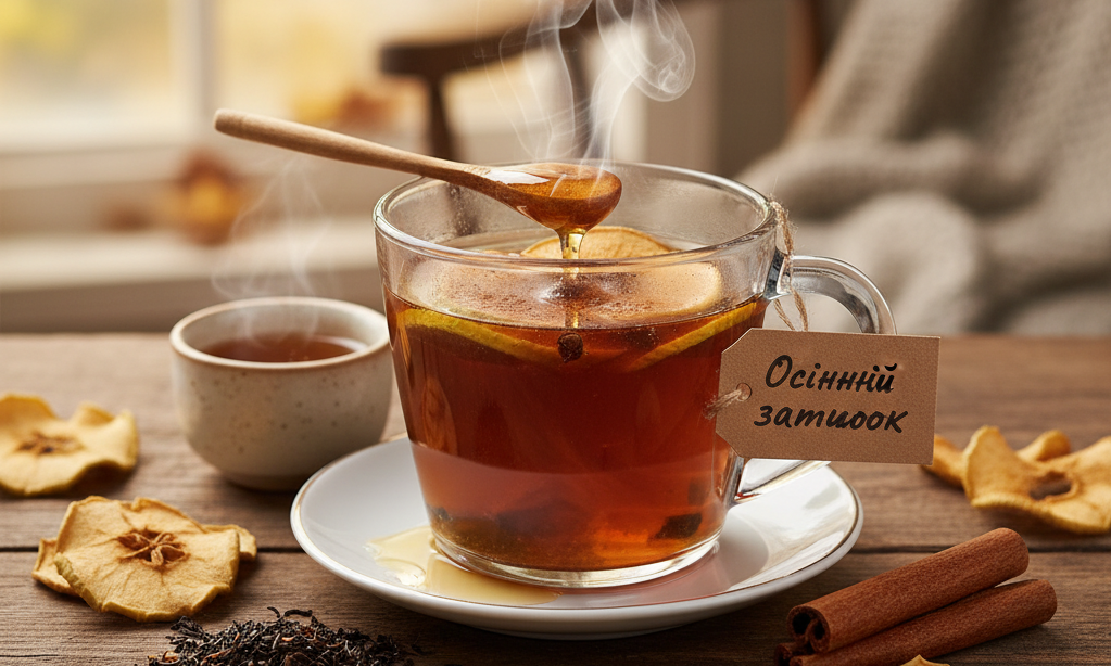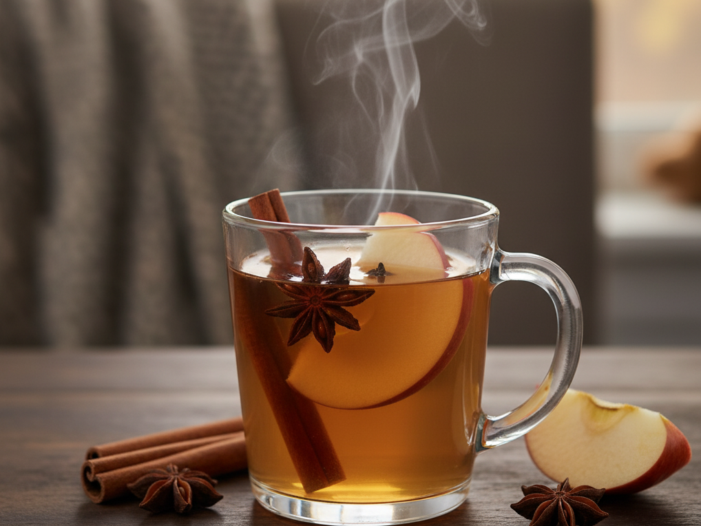Заваріть чорний чай окропом (200 мл). Додайте сушені яблука, корицю та гвоздику. Настоюйте 5–7 хвилин. Перед подачею додайте мед.