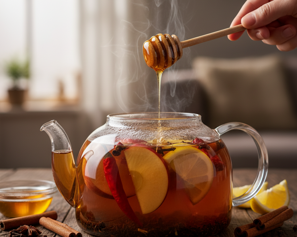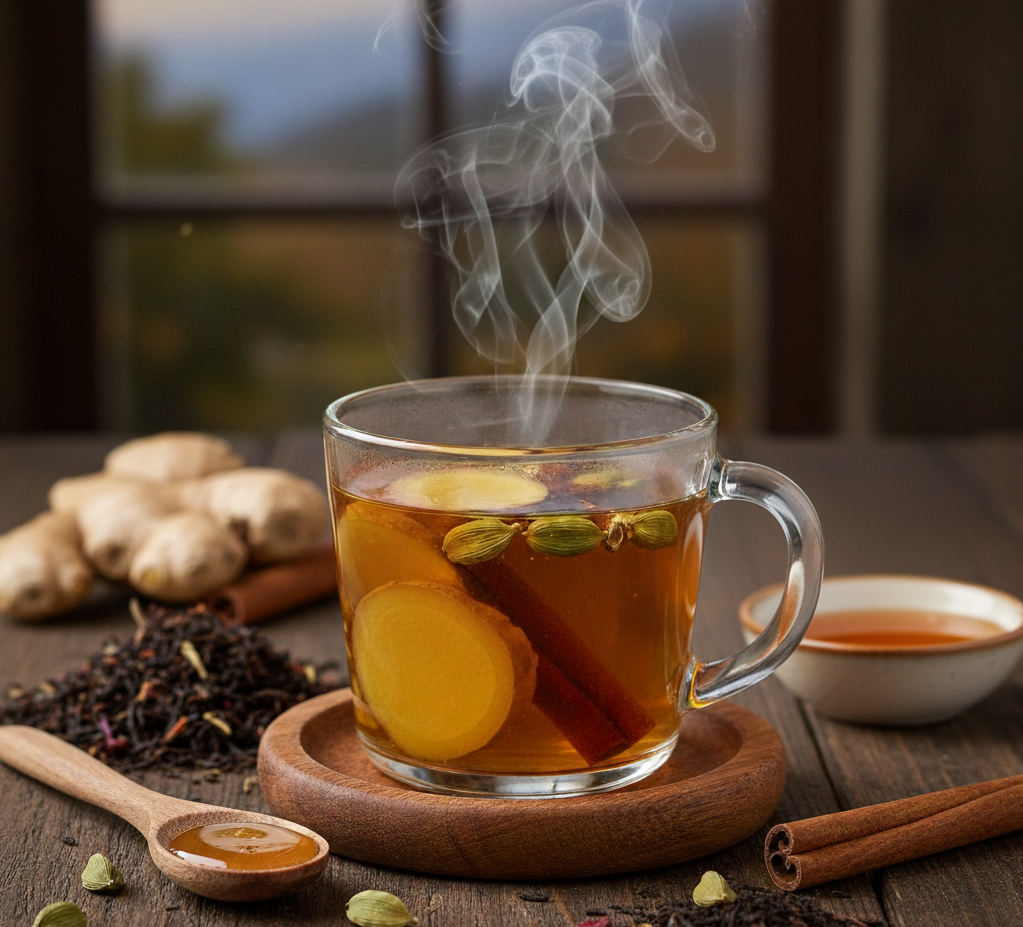 Заваріть чай окропом (200 мл). Додайте імбир, кардамон і корицю. Настоюйте 5–7 хвилин і додайте мед перед подачею.