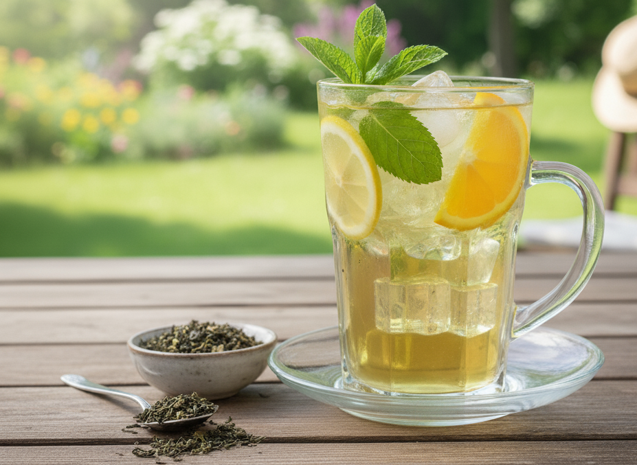 Заваріть зелений чай гарячою водою (80°C) 3–4 хвилини. Додайте м’яту, лимон і апельсин. Для холодного варіанту - додайте лід перед подачею.