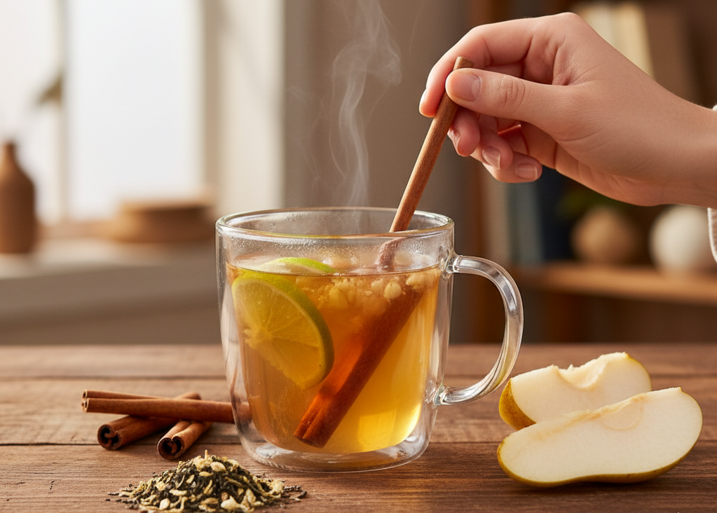 Наріжте грушу дрібно і розімніть у пюре. Заваріть жасминовий чай, додайте сік лайма, грушеве пюре та корицю. Дайте настоятися 10–15 хвилин перед подачею.