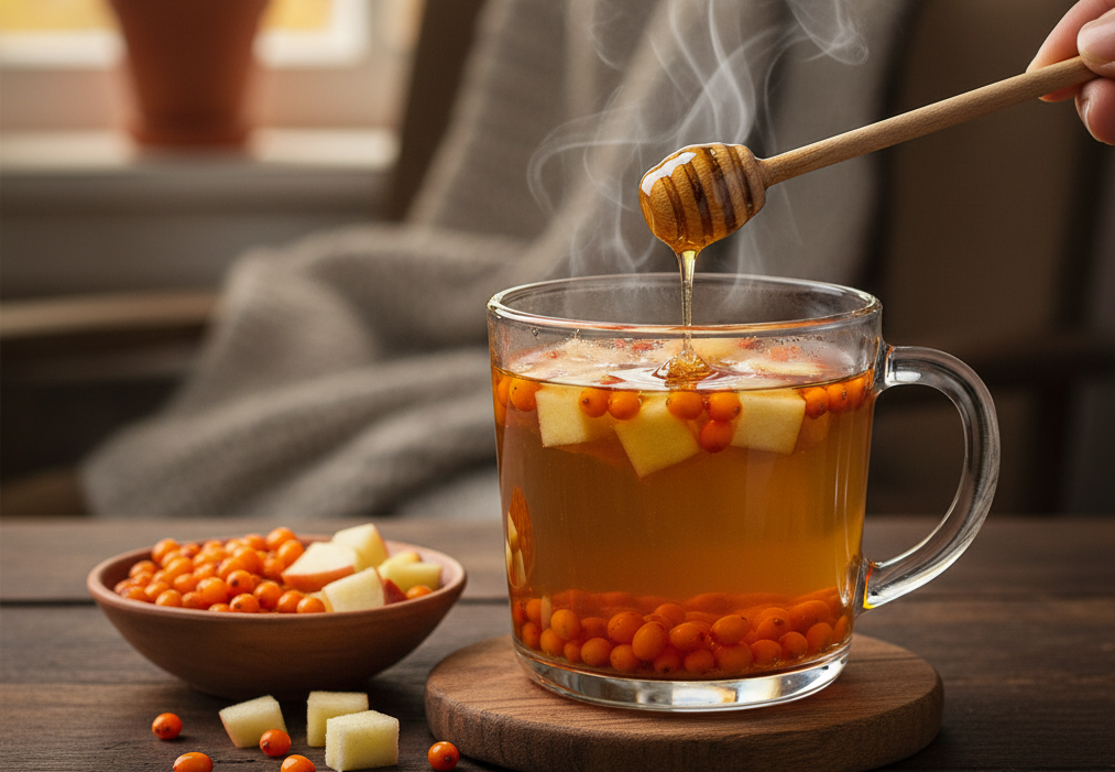 Яблуко дрібно наріжте. Покладіть обліпиху, яблуко і мед у каструлю, залийте холодною водою і прогрійте 15–20 хвилин на повільному вогні, не доводячи до кипіння. Дайте настоятися 3–5 хвилин.