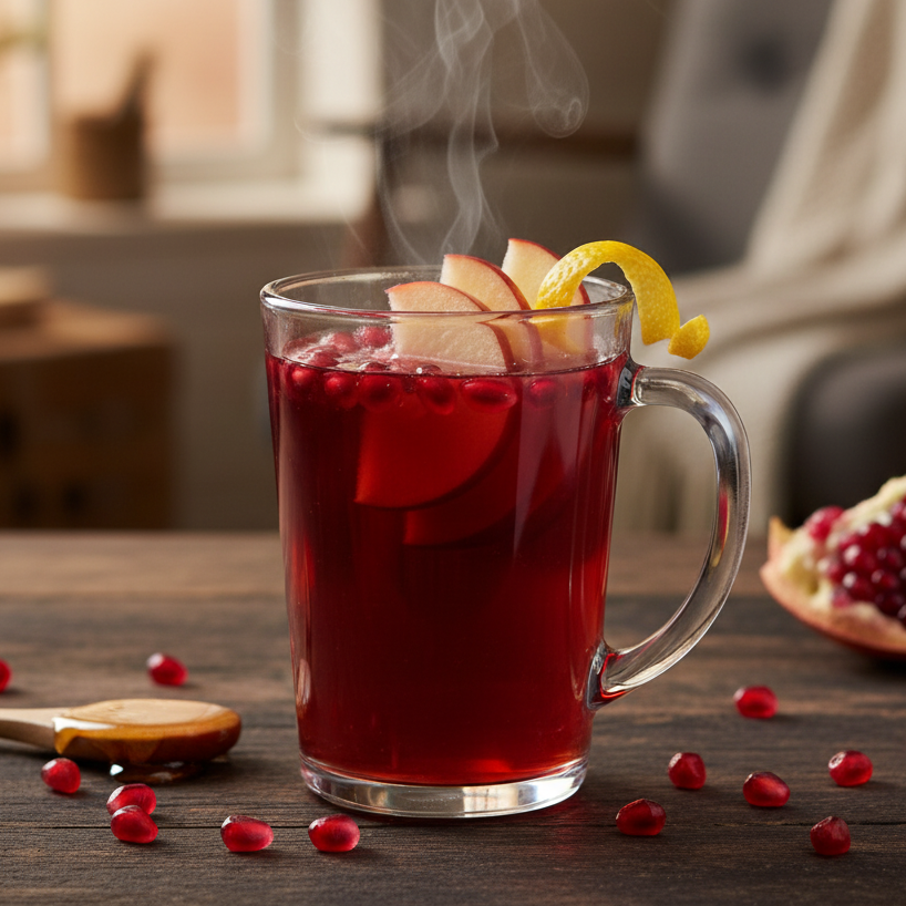 Яблуко наріжте соломкою, цедру тонкими смужками. Нагрійте всі інгредієнти, не доводячи до кипіння, процідіть у келих і прикрасьте гранатом та яблуком.