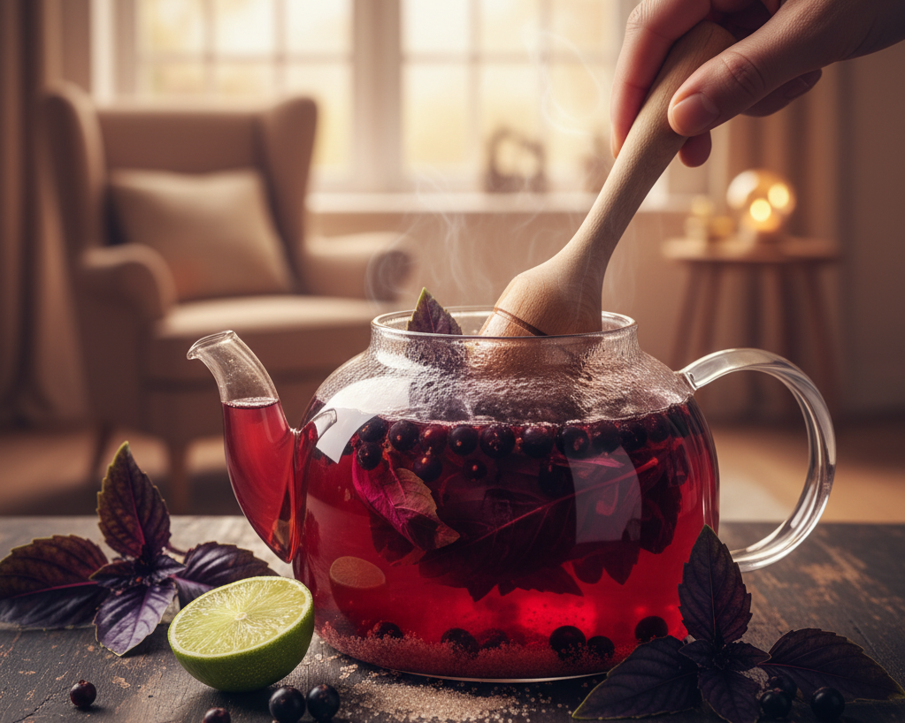 Відокремте листя базиліка, додайте ягоди та цукор, розімніть, залийте гарячою водою (75–80°C), настоюйте 7 хвилин. Перед подачею додайте часточку лайма і прикрасьте базиліком.