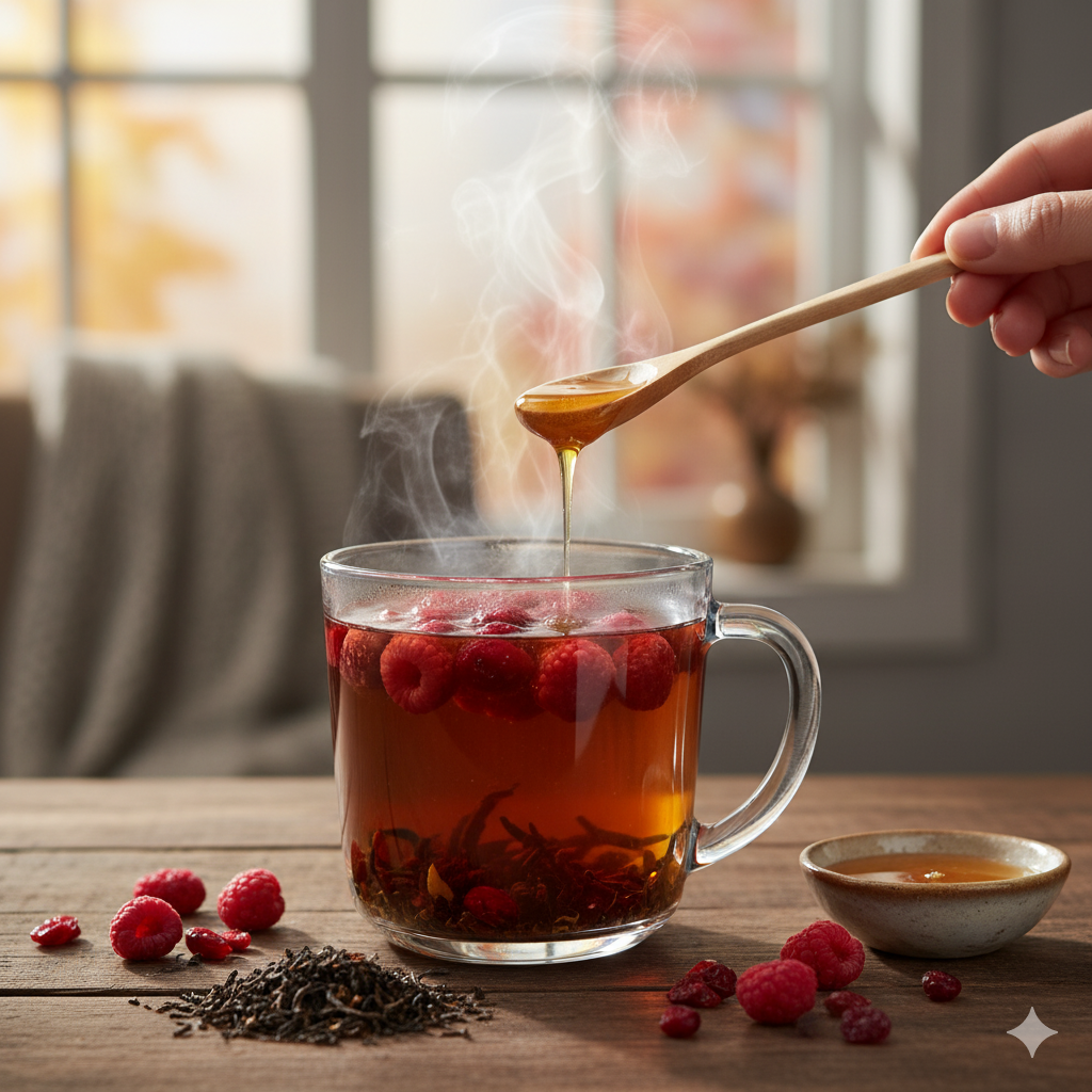 Заваріть чорний чай окропом. Додайте сушені ягоди і настоюйте 5 хвилин. Перед подачею підсолодіть медом.