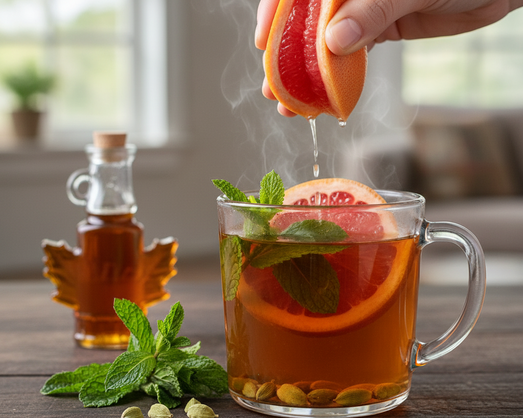 Нагрійте всі інгредієнти, крім грейпфрута, не доводячи до кипіння. Перед подачею вичавіть часточки грейпфрута у чашку.
