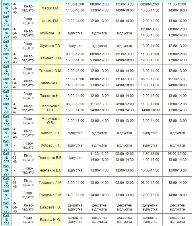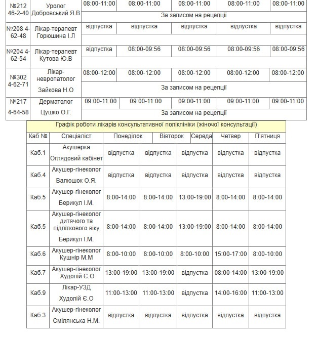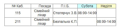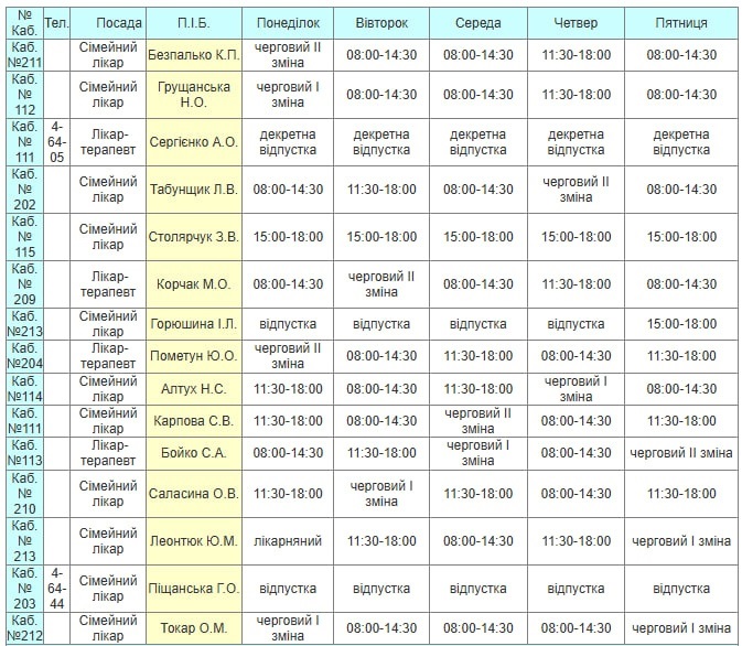 Графік роботи чергових лікарів НКП «ПУ МЦПМСД» 11.10.2025 - 12.10.2025