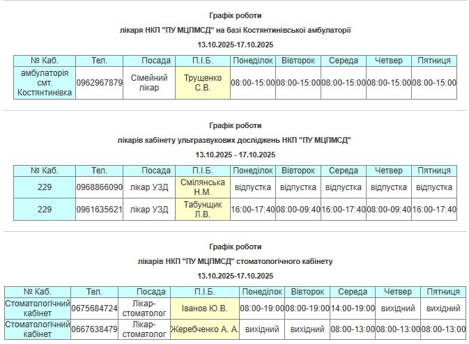 Графік роботи лікарів НКП «ПУ МЦПМСД»з 13.10.2025 по 17.10.2025