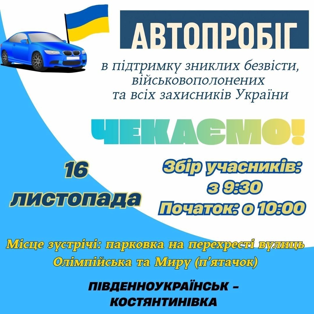 Цього ж дня о 10:00 стартує автопробіг «Чекаємо». Колона автомобілів пройде вулицями Південноукраїнська та Костянтинівки. Усе заради того, щоб голос родин звучав гучніше - щоб про їхніх рідних не мовчали й не забували.