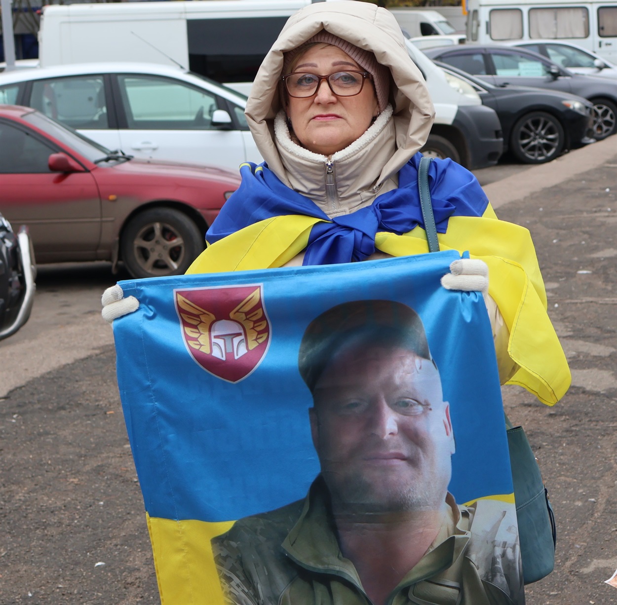 Пані Олена тримала прапор із портретом зятя Юрія Стукалюка. Він зник 16 червня 2025 року під Юнаківкою на Сумщині.