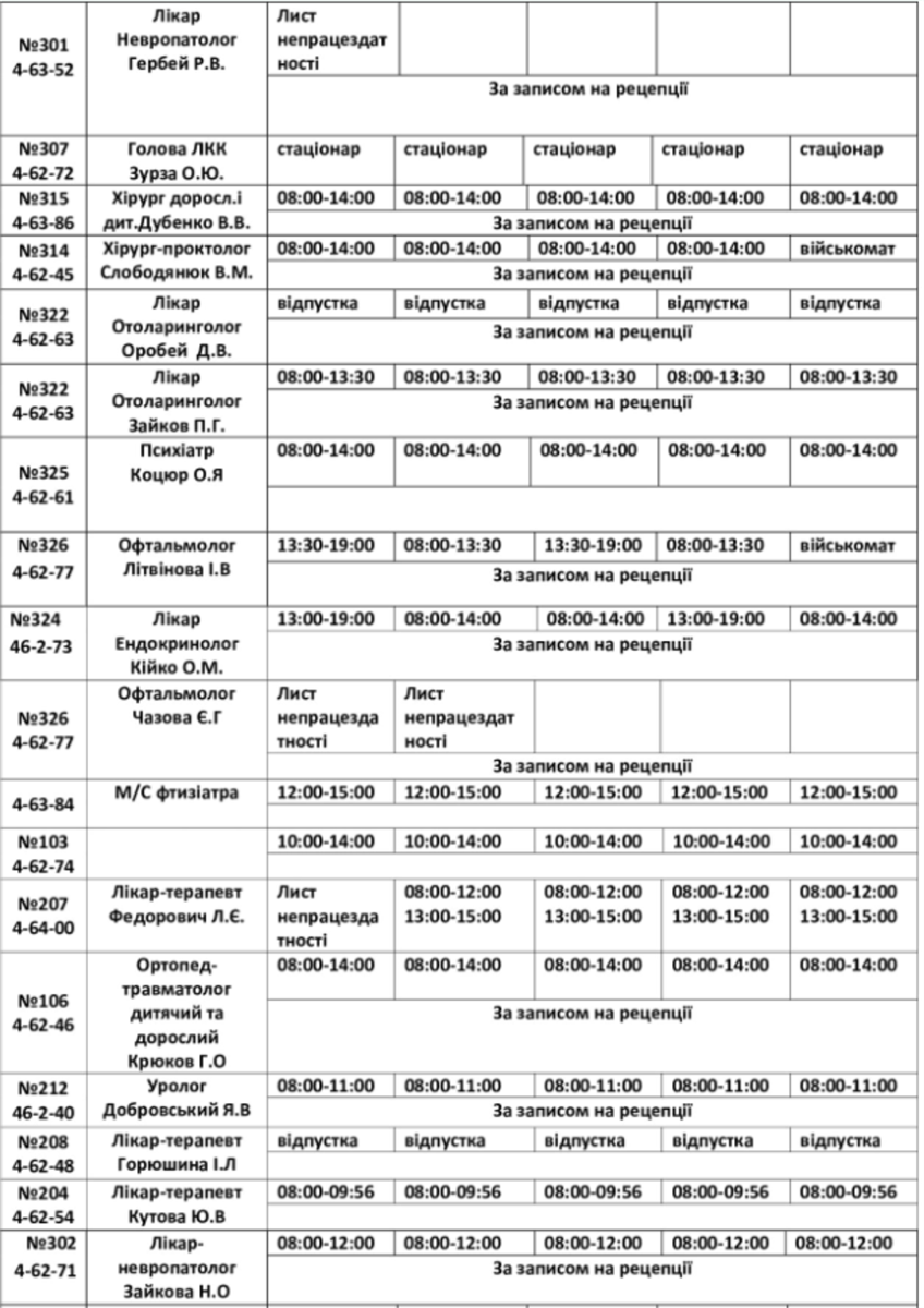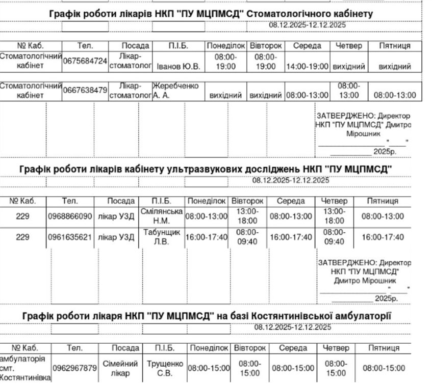 Графік роботи лікарів НКП «ПУ МЦПМСД» з 8.12.2025 по 12.12.2025