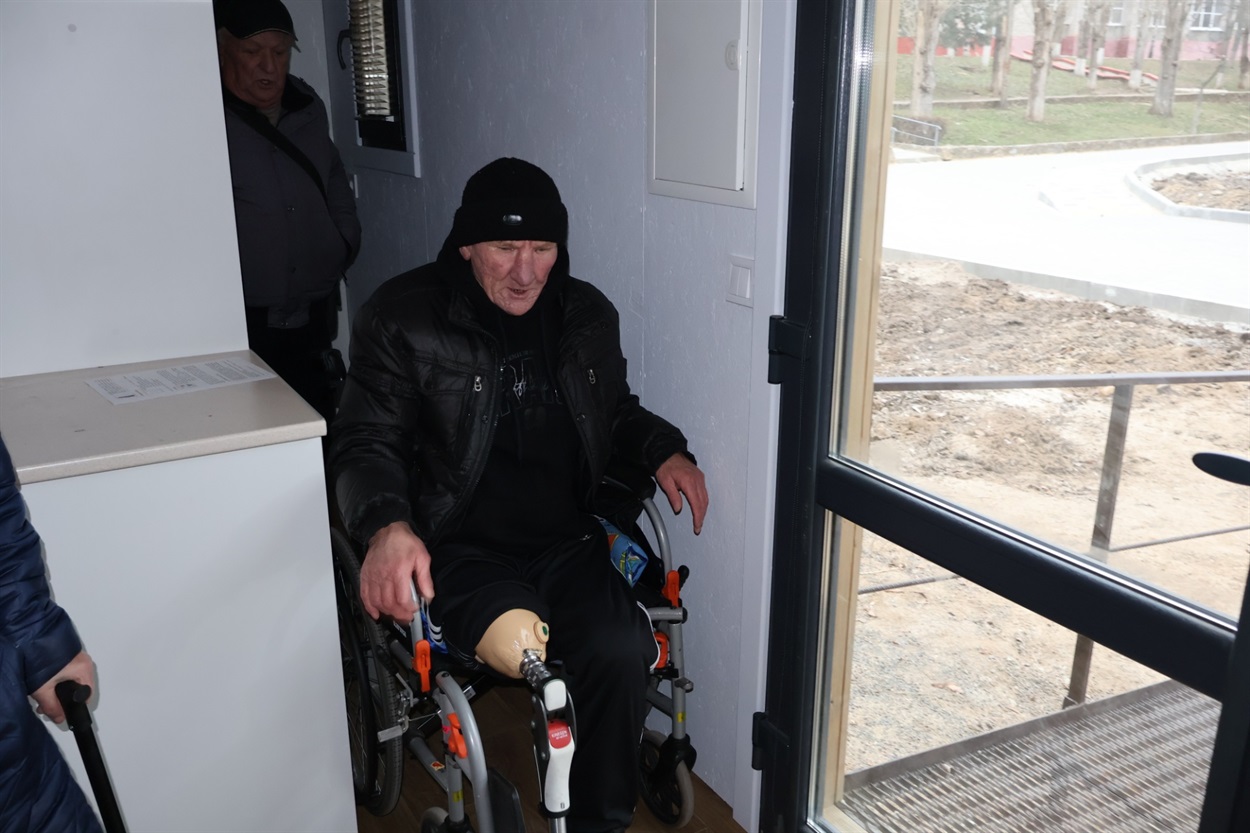 Пан Микола мешкає у Південноукраїнську з 2023 року – переїхав сюди з Херсонської області. Чоловік має інвалідність і пересувається на кріслі колісному. Для нього спеціально облаштували пандус, яким він одразу скористався. Каже: поки що трохи незвично – усе ж перший день. У приміщенні для крісла замало простору, однак це не критично: пан Микола має протез і користується ходунками.