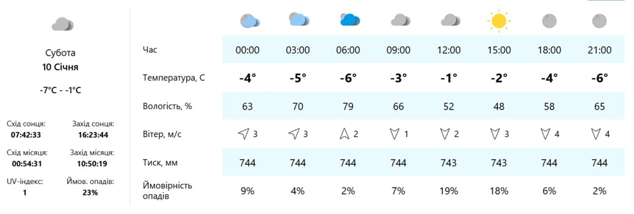 У суботу, 10 січня, в місті збережеться хмарна та холодна погода без істотних опадів. День буде морозним, однак без різких перепадів температури: вдень близько -1 °C, вночі до - 7 °C.