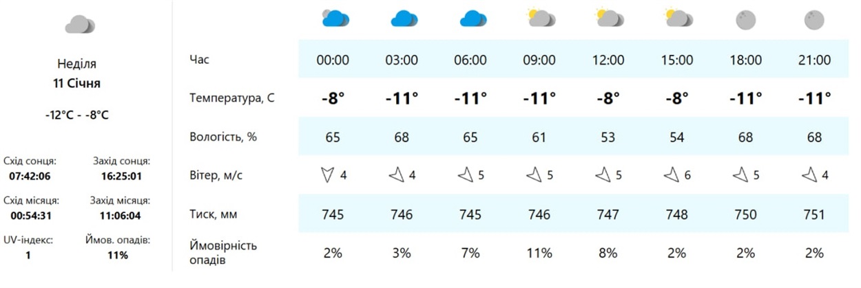 Неділя, 11 січня, принесе помітніше похолодання. Морози посиляться, особливо в нічний та ранковий час. Через низьку температуру можливе утворення ожеледиці на дорогах і тротуарах. Температура повітря вдень: до -8 °C, вночі: близько-12 °C.