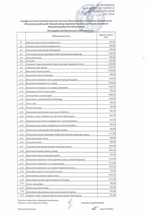 Південноукраїнський міський центр первинної медико-санітарної допомоги оприлюднив оновлені тарифи на платні медичні послуги. У скільки обійдеться консультація та лікувальні процедури для дорослих і дітей у 2026 році, дивіться нижче в матеріалі.