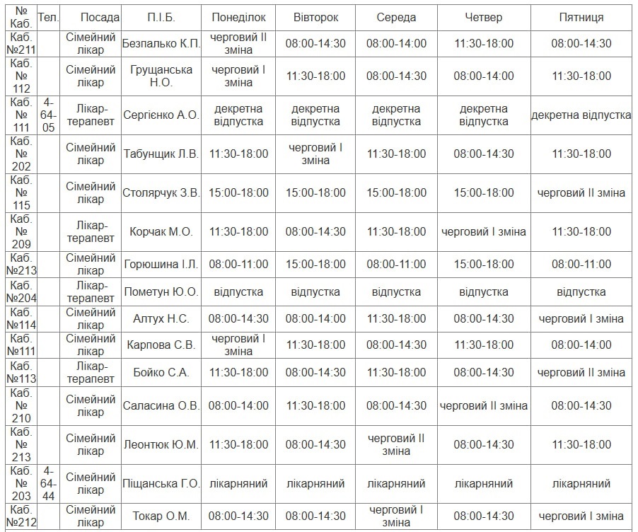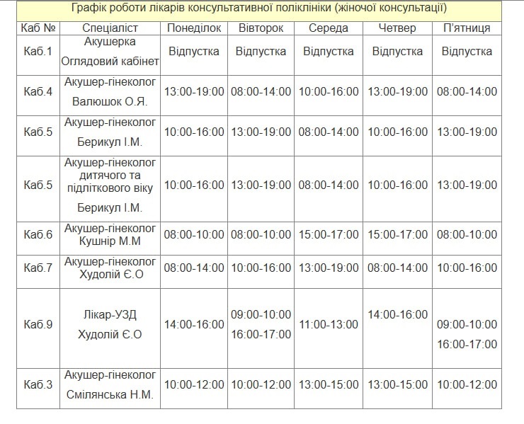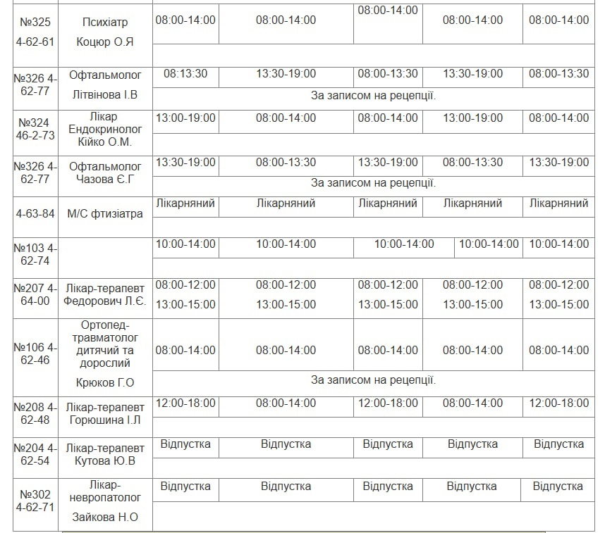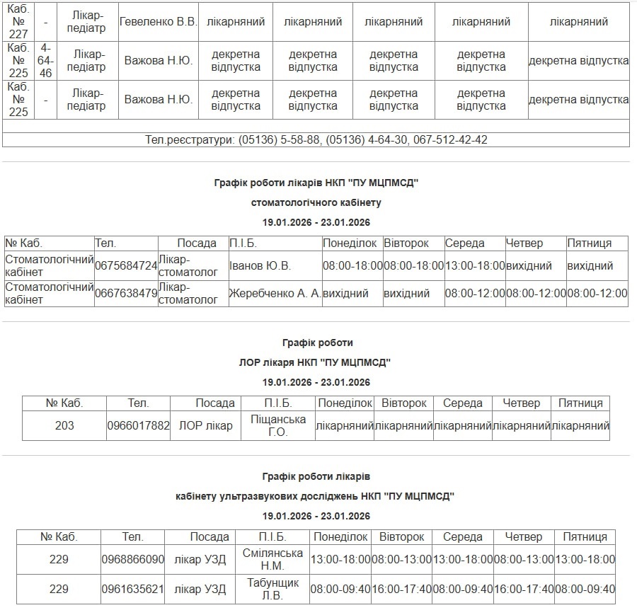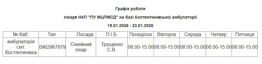Графік роботи лікарів НКП «ПУ МЦПМСД» з 19.01.2026 - 23.01.2026