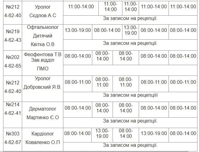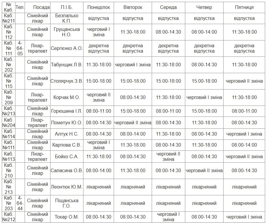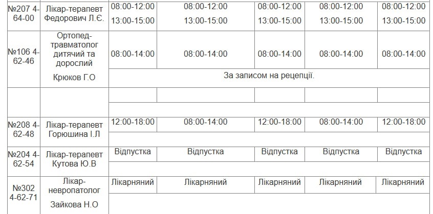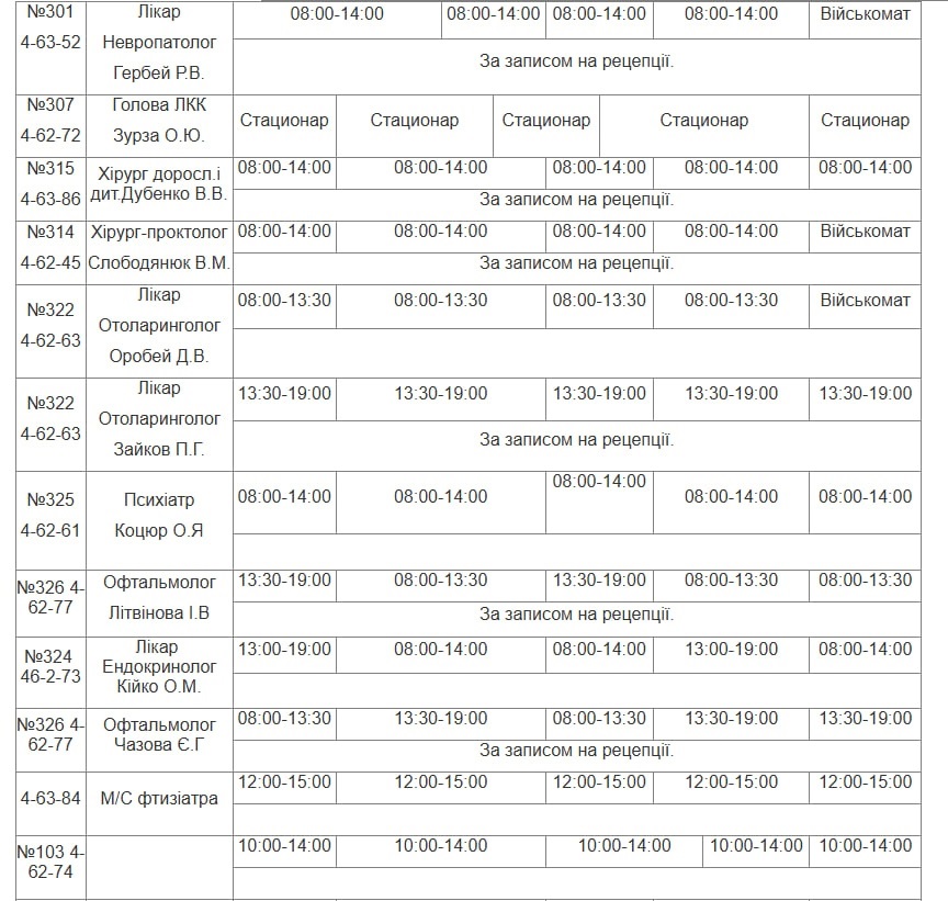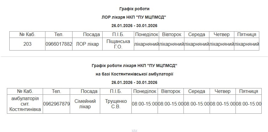 Графік роботи лікарів НКП «ПУ МЦПМСД» з 26.01.2026 - 30.01.2026