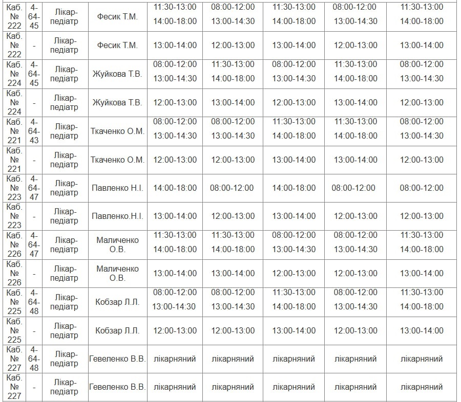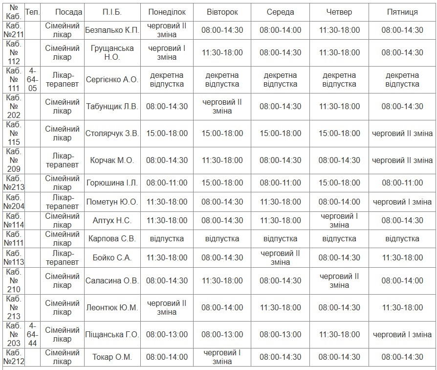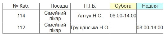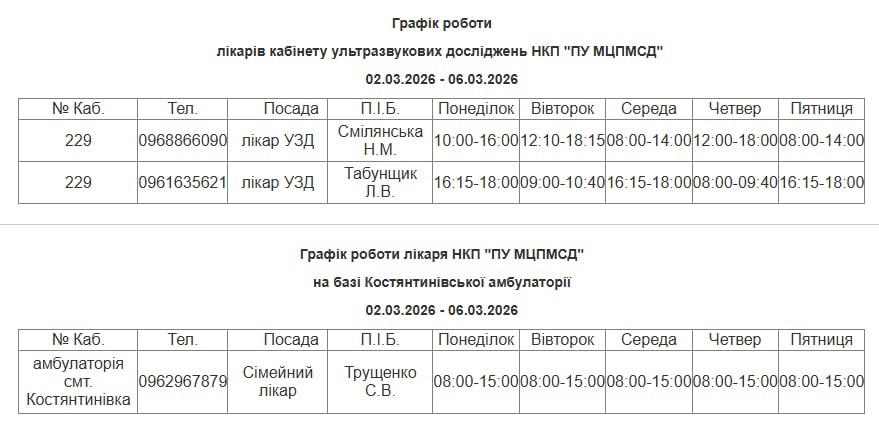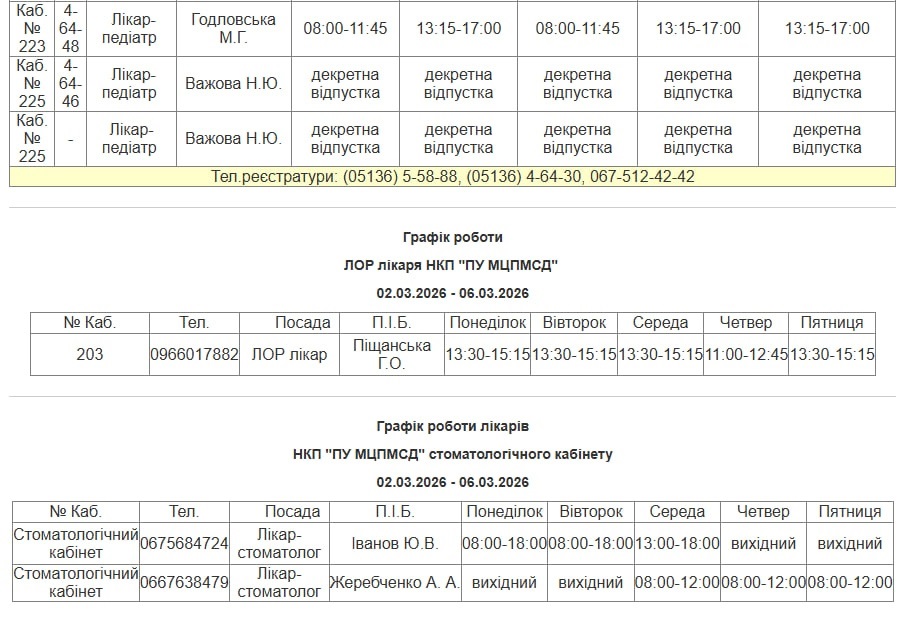 Графік роботи лікарів НКП «ПУ МЦПМСД» з 28.02.2026 по 01.03.2026