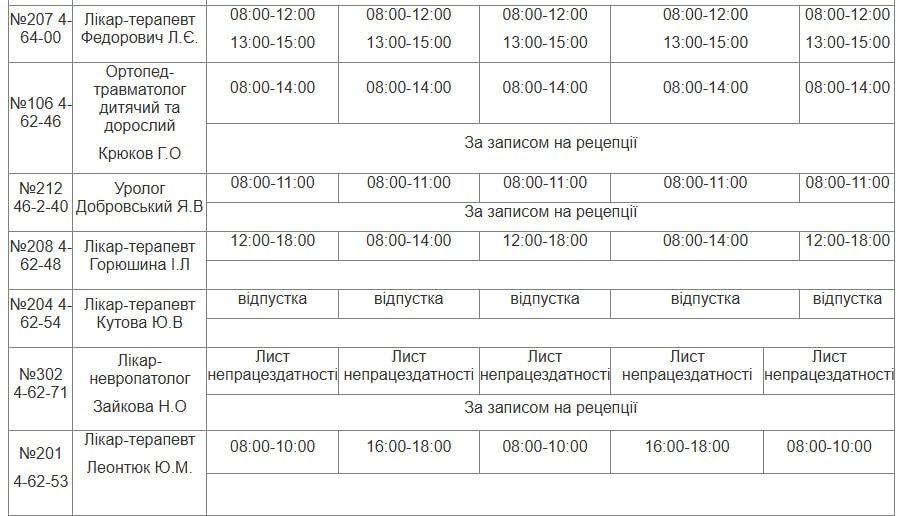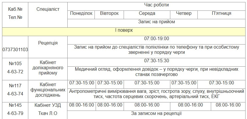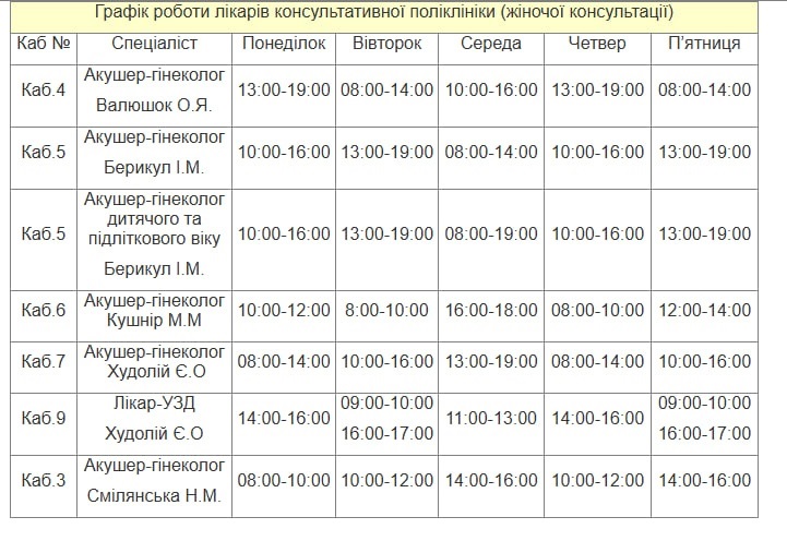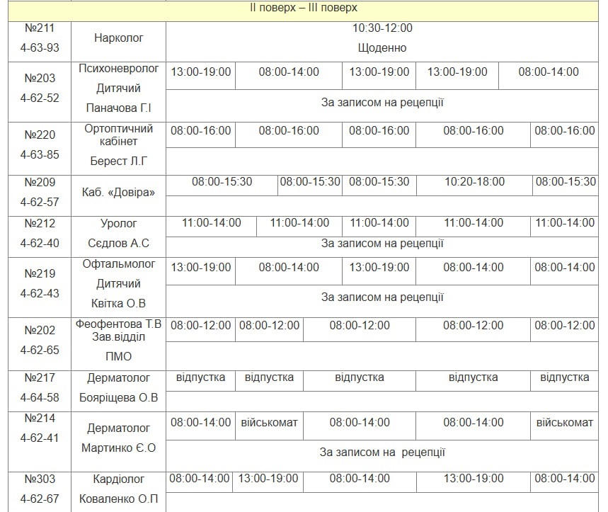 Графік роботи консультативної полікілініки з 02.03.2026 - 06.03.2026