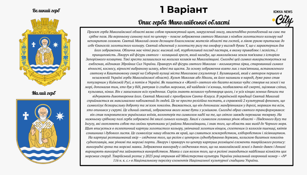 Центральною фігурою цього герба є Святий Миколай - заступник моряків, мандрівників та воїнів, чий образ давно став культурним кодом регіону. Поруч із ним - козацький хрест, що нагадує про коріння Запорізького козацтва на Миколаївщині, та восьмикутна зірка як символ вірності обраному шляху. Основа щита прикрашена хвилями Південного Бугу та Інгулу, а золотий вінець із колосків та соняшника підкреслює наше аграрне багатство. Наявність якоря та елементів таврійського розпису робить цей варіант справжньою енциклопедією традицій області.