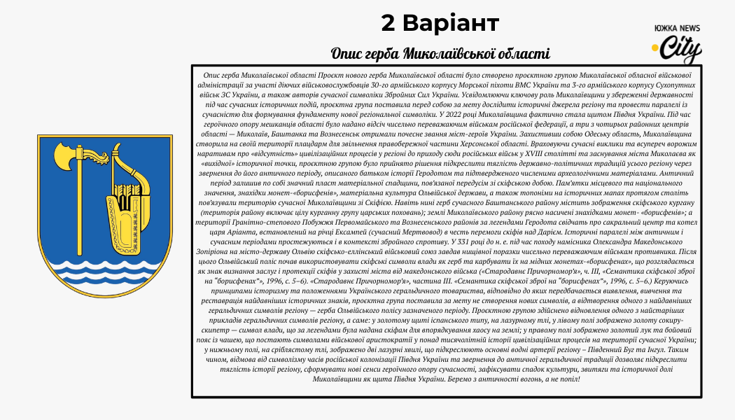 Цей макет переносить нас у часи античності, підкреслюючи тяглість державотворчих традицій ще від Ольвійського полісу. На лазуровому полі зображено золоту сокиру-скіпетр - символ влади, та золотий лук із сагайдаком, що належали військовій аристократії скіфів. Проєкт створено за участі сучасних військовослужбовців, щоб зафіксувати статус Миколаївщини як «щита Півдня України». Відмова від символіки часів російської колонізації на користь античного коріння - головний меседж цього варіанта.