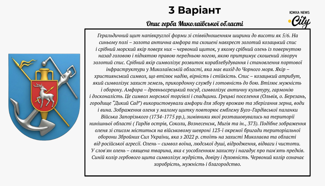 Цей варіант поєднує античну амфору, козацький спис та морський якір. Особливе місце займає малий червоний щит із зображенням срібного оленя - це історична емблема Буго-Гардівської паланки Війська Запорізького. Сьогодні цей же олень прикрашає шеврони 123-ї окремої бригади ТрО, яка захищає область із 2022 року. Поєднання синього (мудрість), золотого (шляхетність) та червоного (хоробрість) кольорів створює образ незламного та багатого традиціями краю.