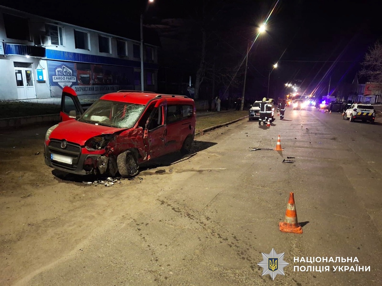 Аварія сталася 6 березня, близько 22:20, поблизу будинку № 38 на вулиці Київській у Вознесенську. Автомобіль Volkswagen Golf (водій 32 роки) зіткнувся з Fiat Doblo, за кермом якого перебував 45-річний чоловік.