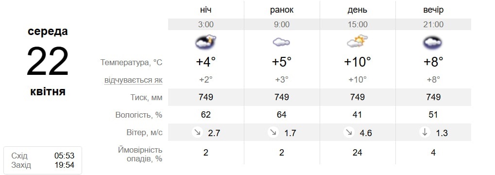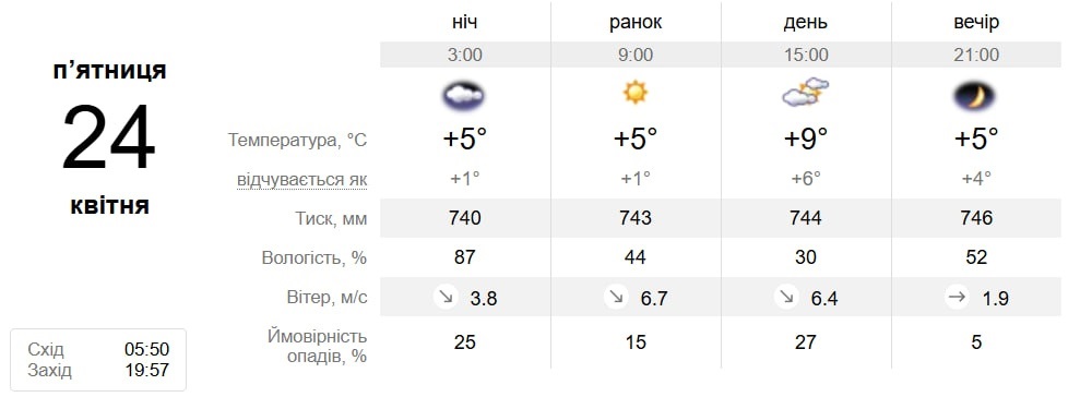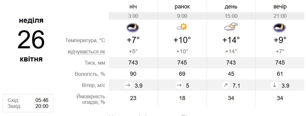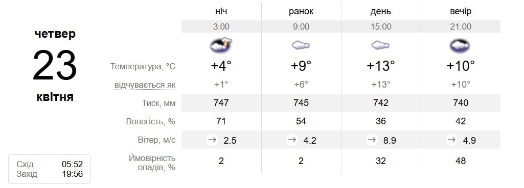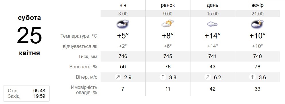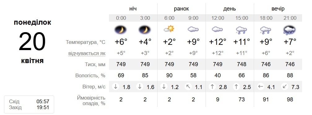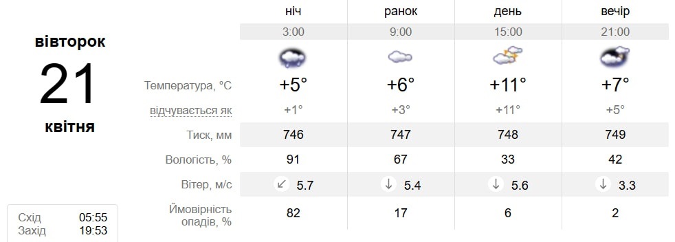 Після сухого ранку вдень очікується до +12 °C. Проте вже по обіді розпочнеться дощ, який до вечора перейде у зливу (ймовірність 98%) із посиленням вітру до 7.3 м/с.